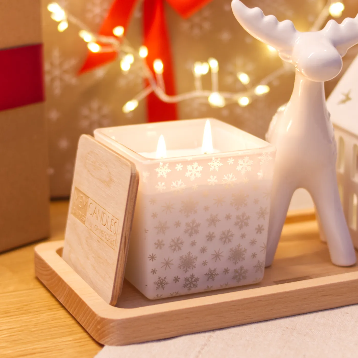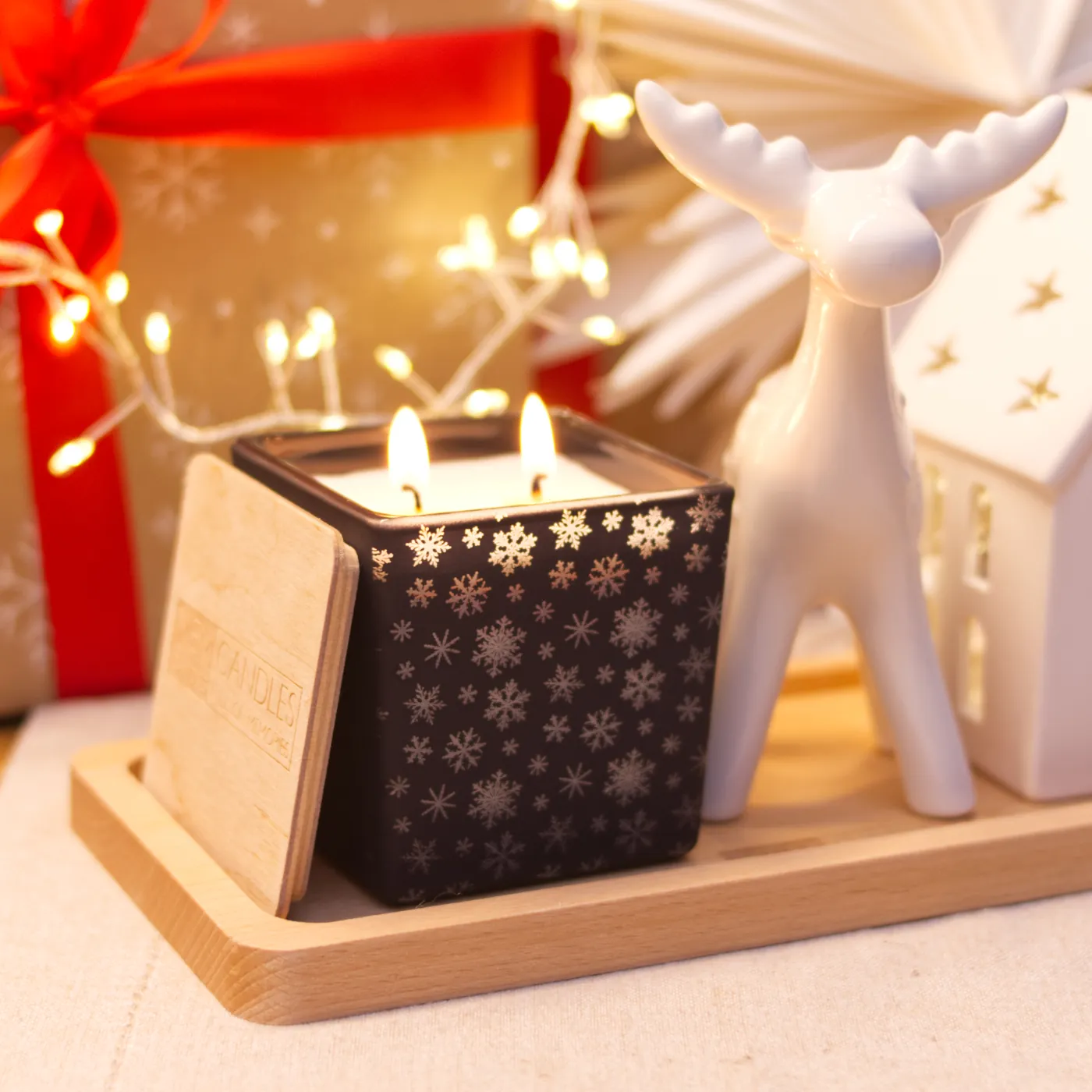 Świąteczna świeca sojowa wykonana z naturalnego wosku sojowego. Idealna na prezent lub drobny upominek. W połączeniu z najwyższej jakości olejkami zapachowymi pozwoli Ci się zrelaksować i odprężyć. Pięknie ozdobi wasz świąteczny stół wigilijny. Motyw płatków śniegu rozświetlony płomieniem świecy wygląda obłędnie.